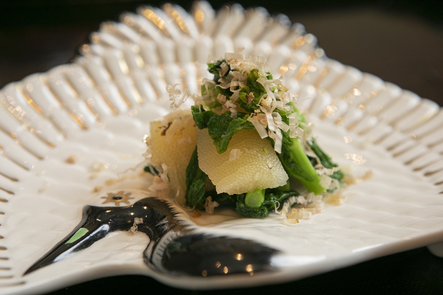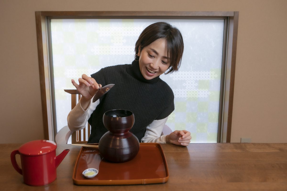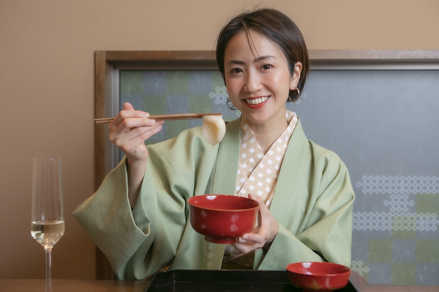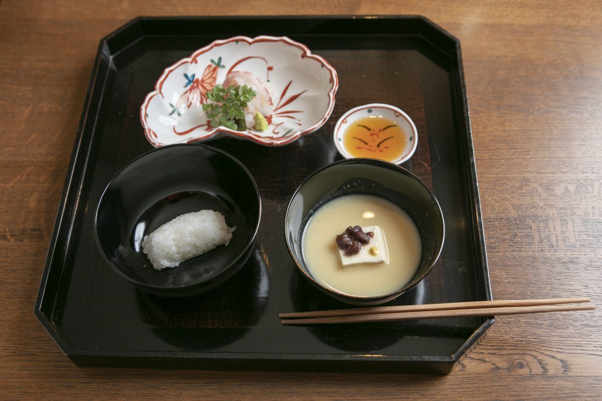 まずはお腹を作るために一汁三菜から始まります。二つ並んだお椀にはそれぞれ、炊き上がり柔らかな一口大のご飯と、酒粕と白味噌で仕立てた味噌汁が。豆腐の上にちょんとのった餡子と辛子がアクセントに。