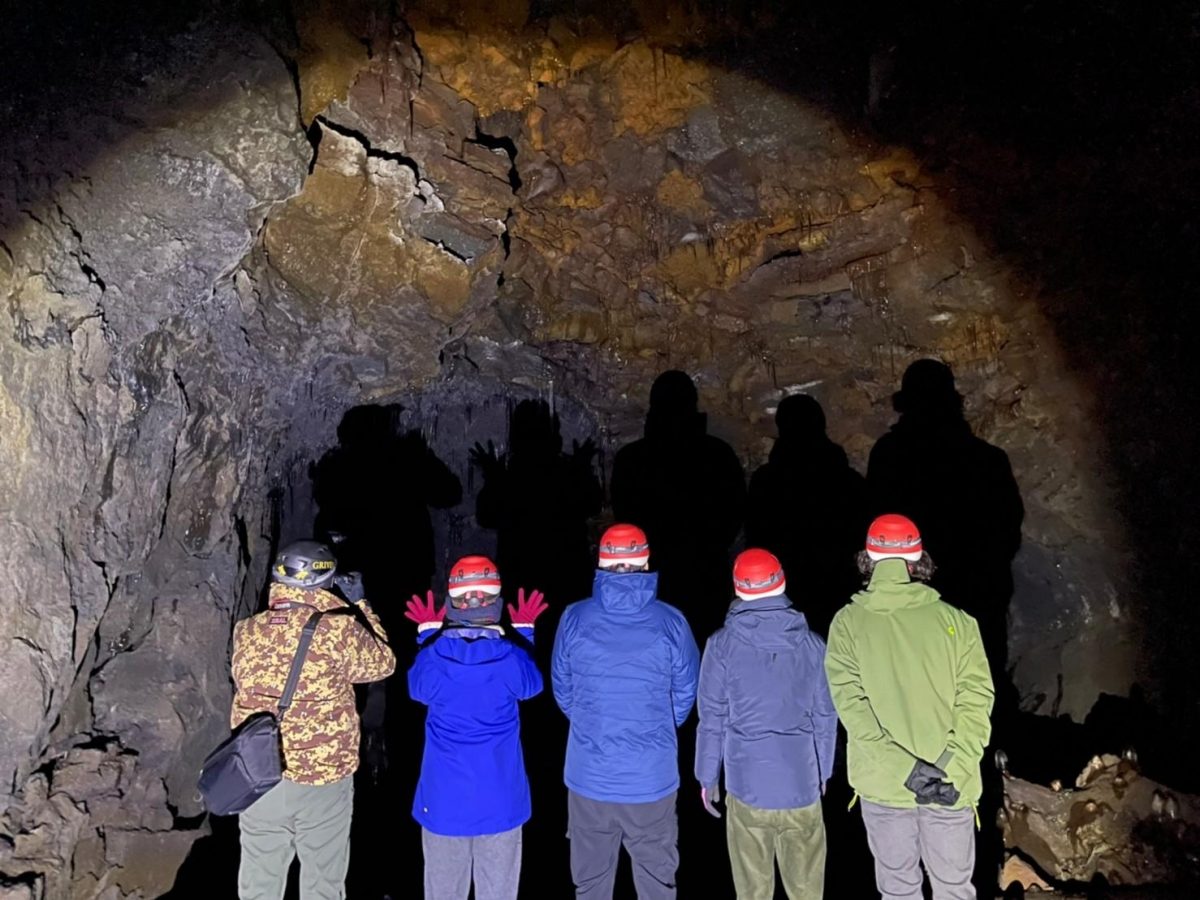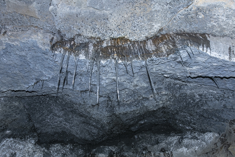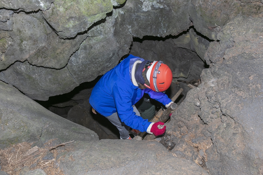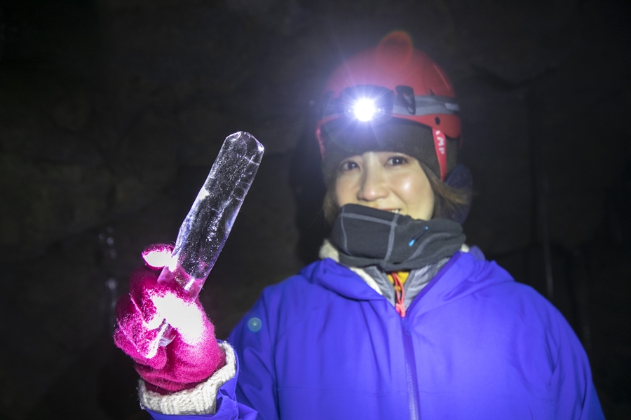 ハシゴをつたって10mほど降りると、地上よりもさらに冷え込んでいるのがわかります。観光用にとりわけ整備されていない手付かずの状態で、暗闇の中ヘッドライトの灯りだけを頼りに、凍りついた岩場の洞窟を進んでいきます。