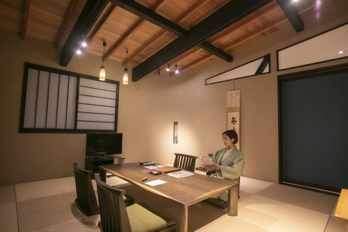 本館客室に加えて、2015年に開業した8つの「別邸 離れ」は、小径の先に広がる日本庭園に点在しています。今回滞在した客室は「天鵞絨(びろうど)」。全室露天風呂付き、それぞれ趣の異なる和の設えと、日本の伝統色が名付けられているのが魅力。ゆとりある贅沢な空間づくりで女子旅や家族旅行にも最適です。