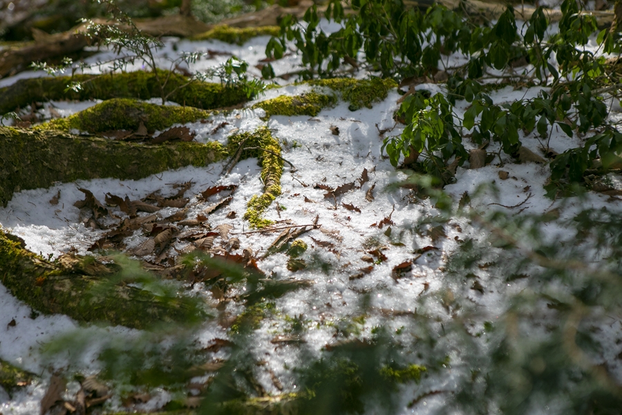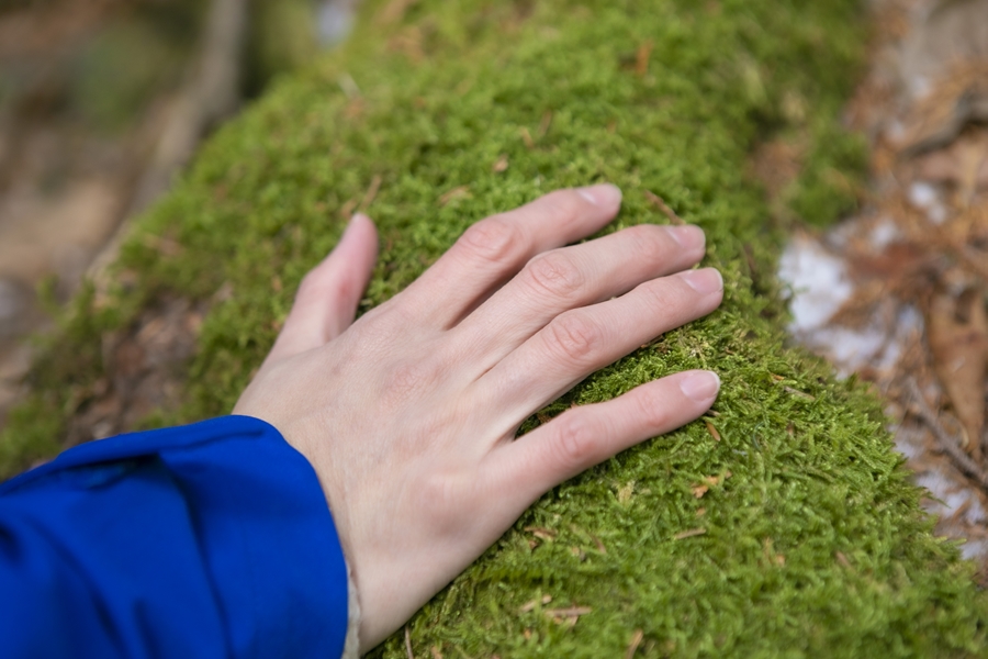 噴火を繰り返してきた富士山。水分や養分の少ない溶岩質の土壌であることから針葉樹が発達し、ドロドロ流れ出た溶岩がやがて冷えて固まったことにより、この一帯はゴツゴツとした地盤になったとか。その上に苔や草が生え、木々の成長を助けています。青木ヶ原樹海の苔は毛足が長く、空気をいっぱい含んでいるため、少し温かく感じられるはず。