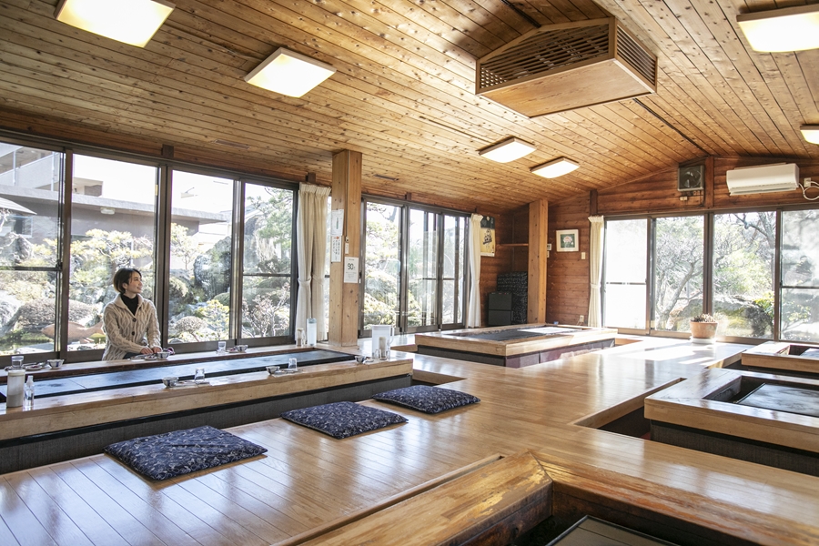 ネイチャーツアーでたっぷり体を動かした後は、お待ちかねのランチへ。溶岩温泉に併設されているお食事処「巻狩」は、創業50年の老舗旅館であり、富士山溶岩プレートの製造・販売元でもあります。敷地内に工場を構え、日本国内の一流ホテルやレストランに卸しているそう。