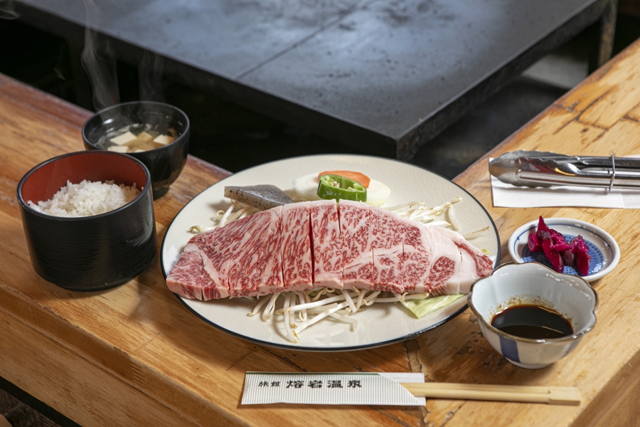 メニューは国産牛サーロイン、豚ロース、猪肉などを使ったステーキ定食がメインで、国産牛は全国から日替わりで入荷したお肉を提供しています。今回はブランド甲州牛200gをいただきました。脂がしっかりのって食べ応えがあり、ご飯が進みます。ちなみに、お米も溶岩マリモを入れて炊いていて、溶岩のミネラル効果でより一層美味しく感じました。