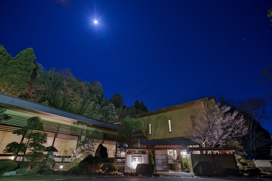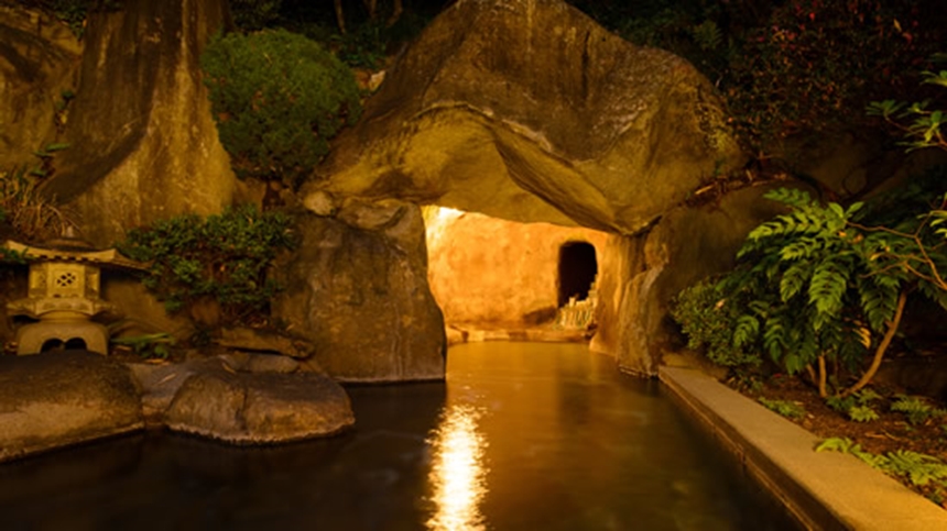 滞在中はぜひ、源泉掛け流しの大浴場も利用したいところ。先人が掘り出したという洞窟風呂はこの宿の名物。敷地内から湧出するアルカリ泉で、とろみがあり、ほんのり硫黄の香りが漂う“美人の湯”として定評があります。湯上がりに、はたまた酔い醒ましに、月を眺めながら、風情漂う庭園を抜けて客室へそぞろ歩くもまた至福のひと時。