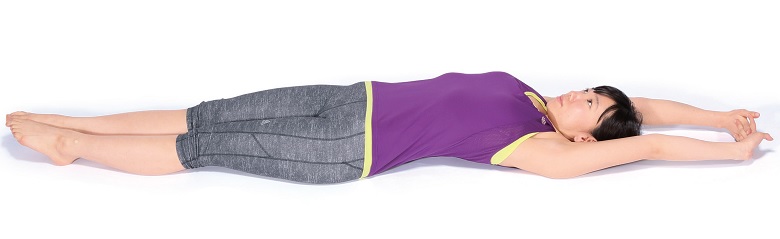 - ゆっくりと両手と両脚をまっすぐ伸ばし、全身をストレッチ。背すじを伸ばして、手と脚が両方から引っ張られているようなイメージをもつ。