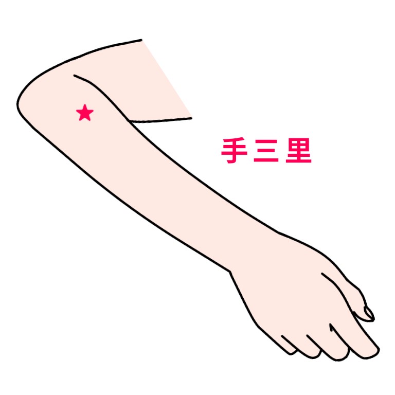 腕の外側にあります。肘を曲げたときにできるシワから指3本分の手首側が手三里です。ツボを刺激することで筋肉をゆるめられるので、ストレッチと同じような効果が期待できます。