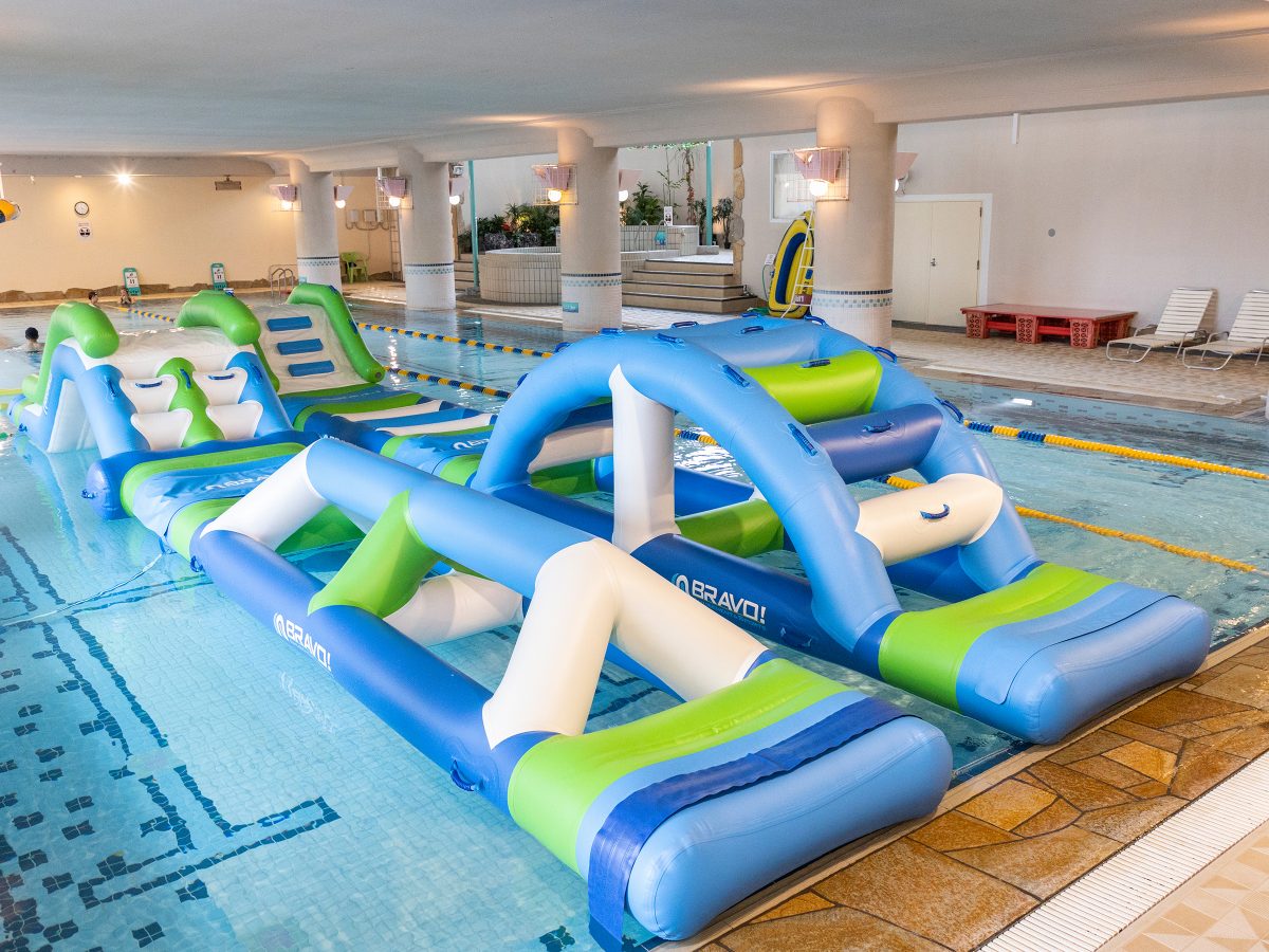 「25メートル温水プール」には現在ウォーターアスレチックが常設されています。水上に浮かぶ遊具で遊ぶだけで全身運動になり、不安定な水上でバランスを取るため体幹強化にもなりそうです♪