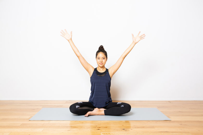 - 肩甲骨を意識しながら両手を上げ、バンザイのポジションに。