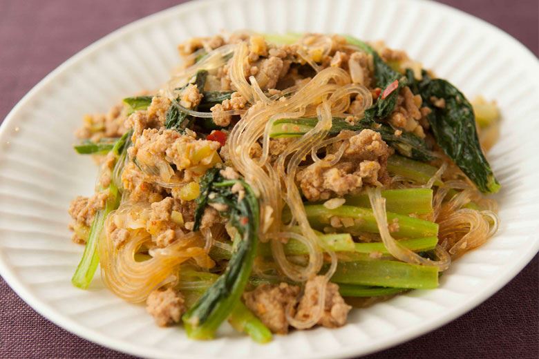 2  フライパンに油を熱し、豚肉、ショウガ、ニンニク、長ネギを入れて炒める。肉に火が通ったら豆板醤を加え、小松菜の茎の部分を加えてさっと混ぜ、よく混ぜ合わせたAを加える。春雨を汁に浸し入れ、上に小松菜の葉をのせ、フタをして2~3分煮たら、全体をよく混ぜる。味見をし、味が薄ければ、塩少々(分量外)で味を調える。