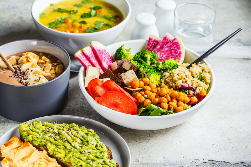 ヴィーガン食だからといって窮屈な食事をしているわけではありません。穀物、豆、野菜、海藻、果物、ナッツなど植物性の食品でバラエティに富んだメニューを考えられます。ハチミツ、卵、乳製品などは避けますが、その代わりに豆乳やライスミルク、アーモンドミルクなどを使います。