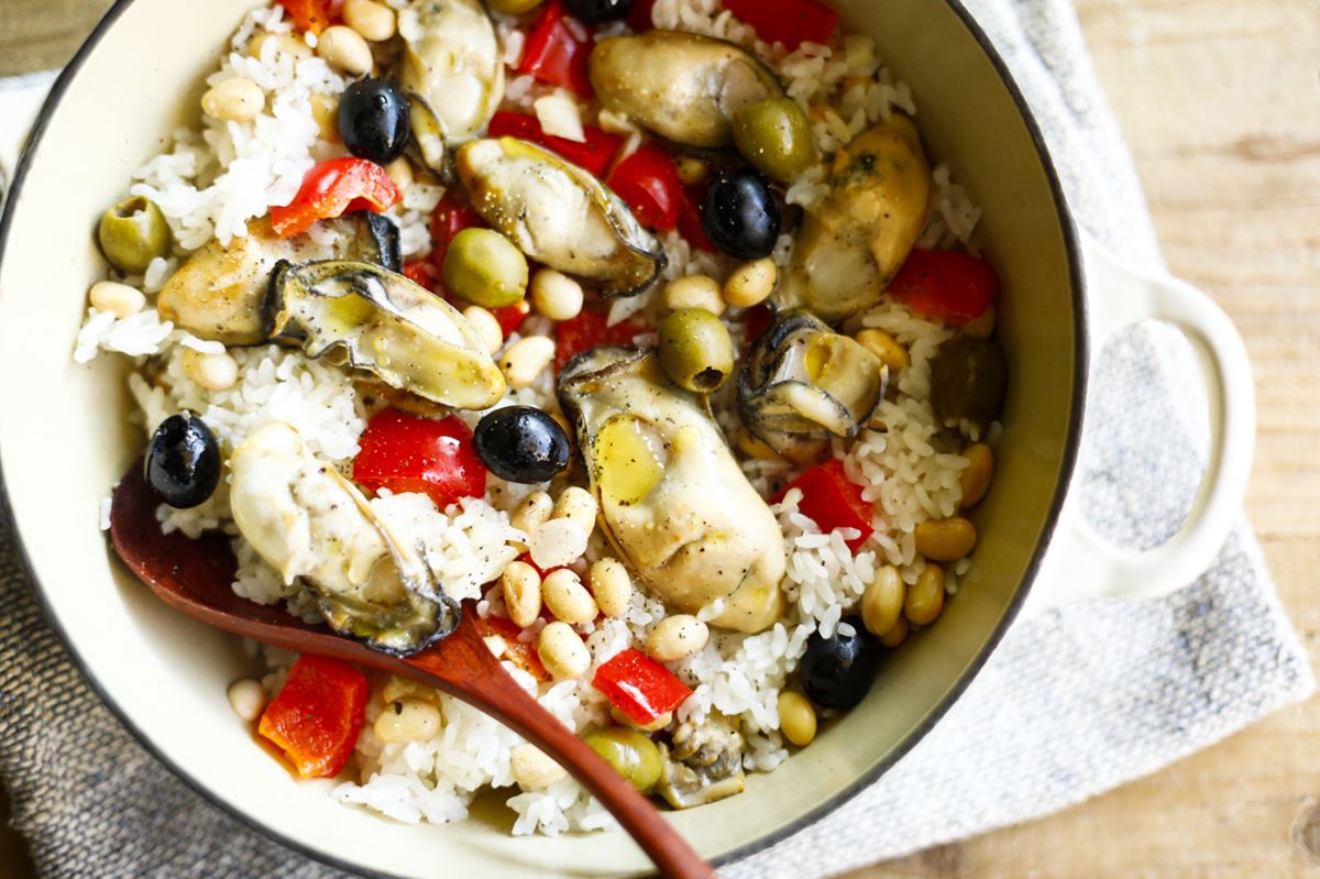 2:米を研いで炊飯釜に入れ、1、牡蠣、オリーブ、大豆水煮を加え塩、オリーブオイルを加えて普通に炊く。