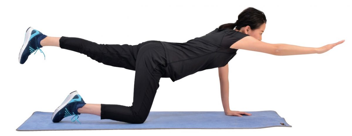 背すじをまっすぐにして両手・両膝を床につきます。その状態から片方の手は肘を伸ばしたまままっすぐ前に突き出し、逆側の脚の膝を伸ばして後ろへ突き出します。上肢・体幹部・下肢が一直線になったら、そのままキープします。これを左右行います。