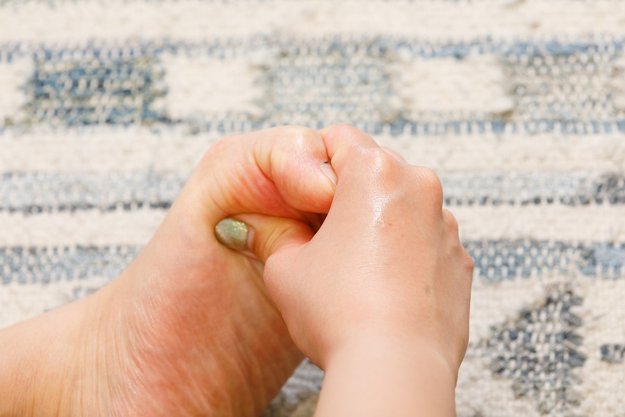 今度は手をグーにします。第2関節を足の指の間に滑らせましょう。足首もグーを使ってゴリゴリとほぐしましょう。