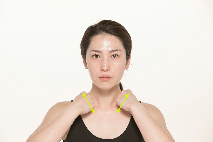 親指と人差し指で鎖骨を軽くつまみ、左右に往復して滑らせる。これを2〜3回繰り返す。