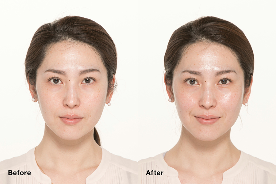 たった5分でこの変化!頬の頂点の位置が高くなって、中央にパーツが集まってぐっと引きあがった印象になります。