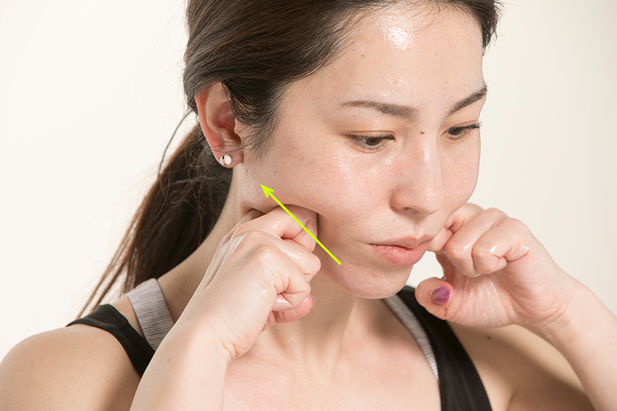 中指の側面で小鼻の横をぐっと押し上げる。小鼻から耳下に向かって、頬骨の下を持ち上げるイメージで引き上げる。これを2〜3回繰り返す。