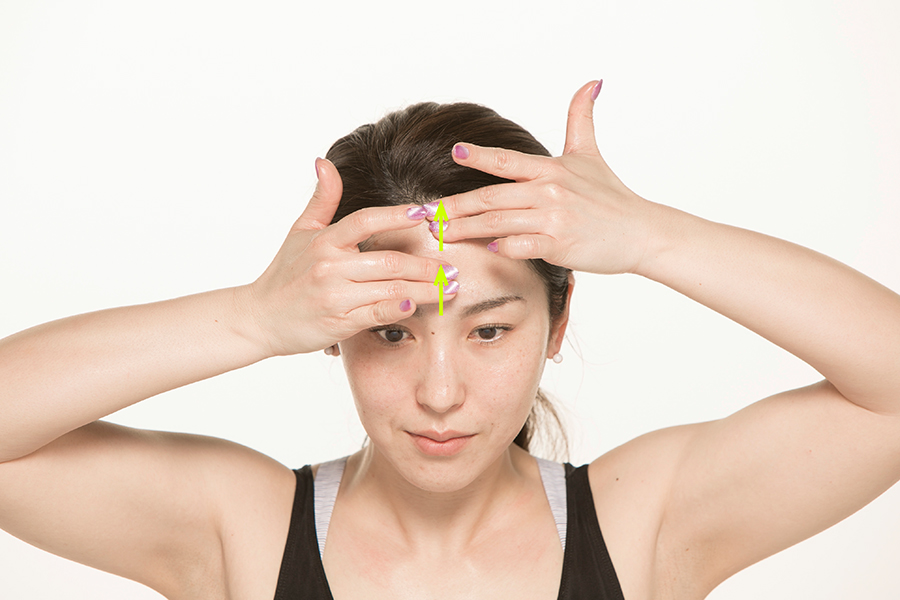 両手の中指と薬指で、下から上へ眉間をリズミカルにさすり上げる。6回程度行う。