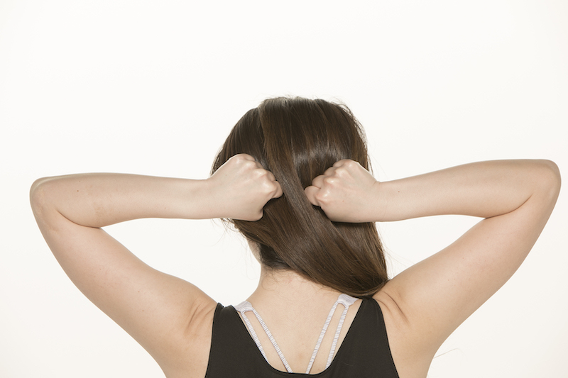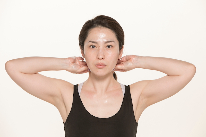 親指と人差し指、中指で耳下の太い筋を軽くつまむ。少しずつ位置を下に移動させながら、首筋をくるくると円を描くように揉みほぐす。これを2〜3回繰り返す。