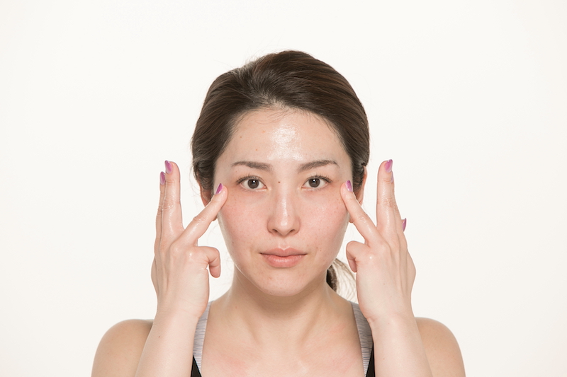 骨に沿って、目頭から目尻に向かって指を滑らせる。これを2〜3回繰り返す。