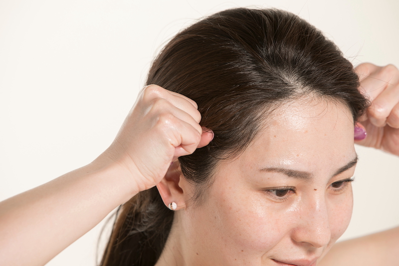 親指の第2関節やブラシの柄など硬いもので耳の上のくぼみをゴリゴリほぐす。