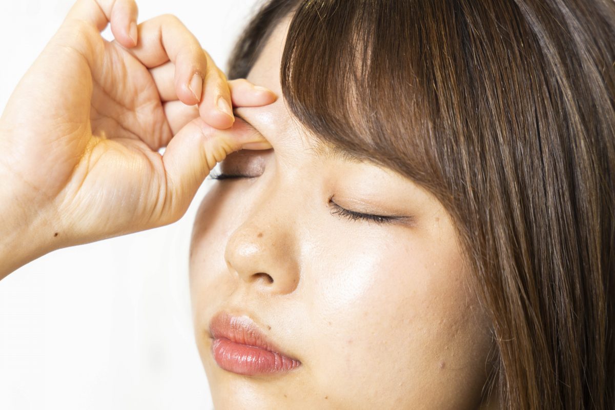 目頭のくぼみに親指を当て、人差し指を添えて眉毛をつかみます。親指をグッと上方向に押しながら、眉毛を上下に動かしましょう。指を横にスライドさせながら、眉頭から眉尻まで行いましょう。