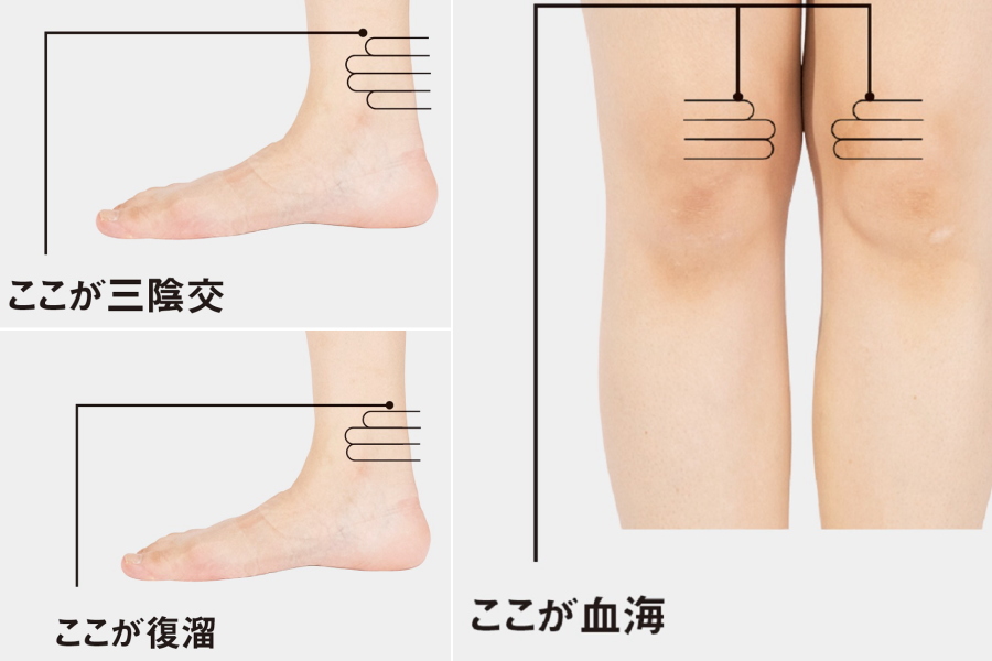 ホルモンバランスを整える効果があり、生理不順、生理痛の改善などの不調を抱えている人におすすめのツボ。手足の冷えや、むくみ、腰痛にも効果的なツボとして知られています。
