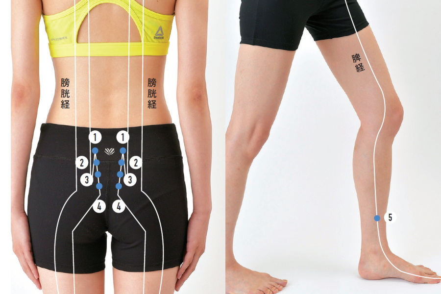 ①~④は骨盤まわりにあるツボ。自律神経やホルモンバランスを整えます。骨の両側に両手の親指の腹を当て、上髎・次髎・中髎・下髎の順に押していきます。手のひらを当てて押してもよいでしょう。