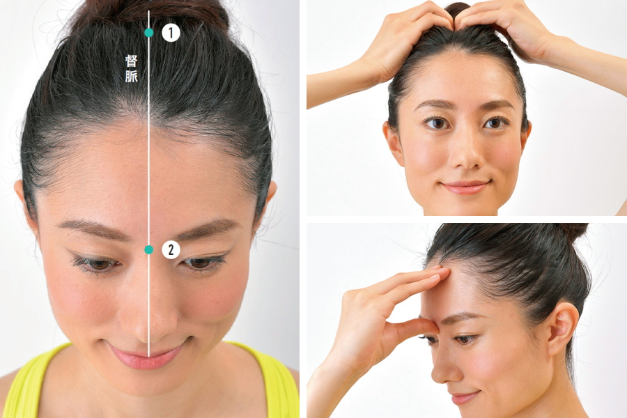 ①②は頭部にあるホルモンバランスを整えるツボ。①は両手の4本の指の頭をM字のかたちでツボに当て、押し込むようにして刺激します。②は手をU字のかたちにし、3本の指を額に置いて支えながら、親指の腹をツボに当てて気持ちいいと感じる程度に押します。