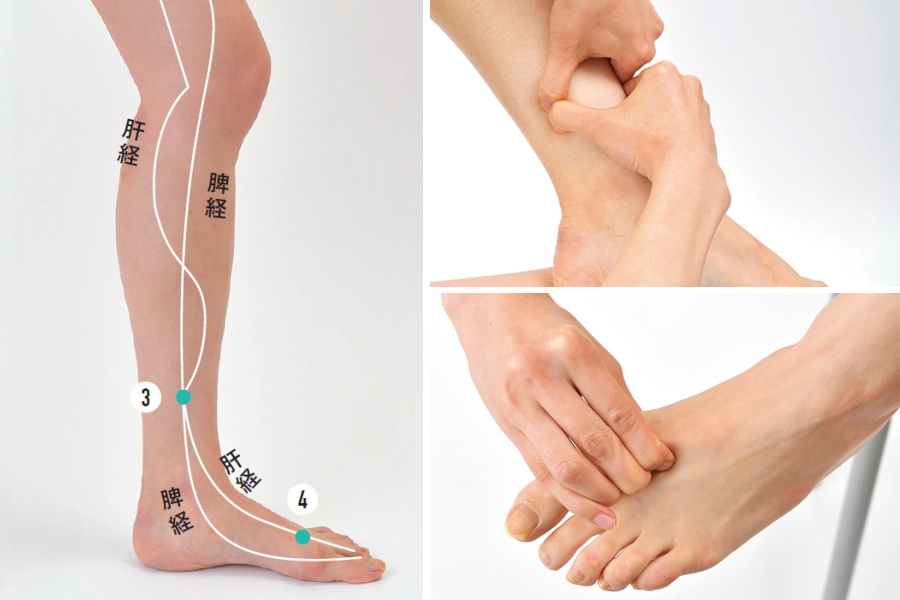 肝臓・腎臓・脾臓の3つの経絡が交わっているツボ。婦人科の症状にきき、生理痛にはとても効果があります。内くるぶしから指4本分上のところにあるこのツボは、毎日押し続けていると巡りがよくなるので、コツコツ押すことも大切です。