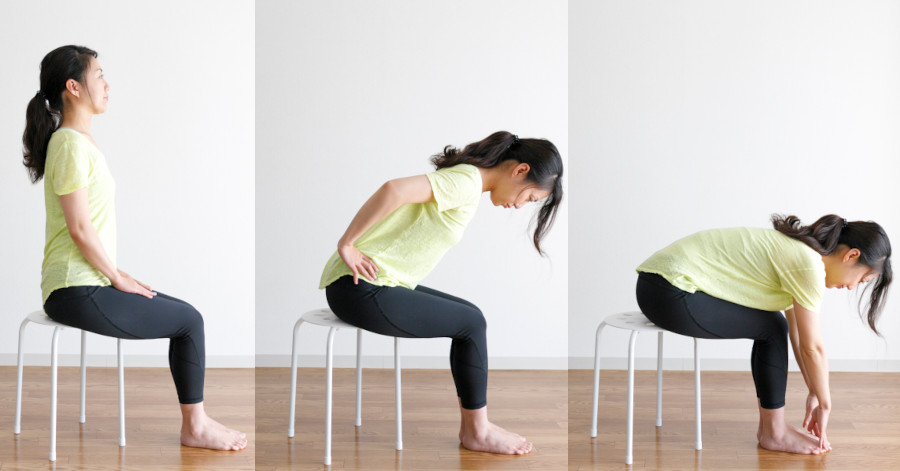 この時、背中を意識しておこなうことがコツです。猫背のままではなく、背筋を伸ばして腰からまっすぐ伸びた背中を折ります。また、座る位置も深く腰掛けず浅めにしましょう。