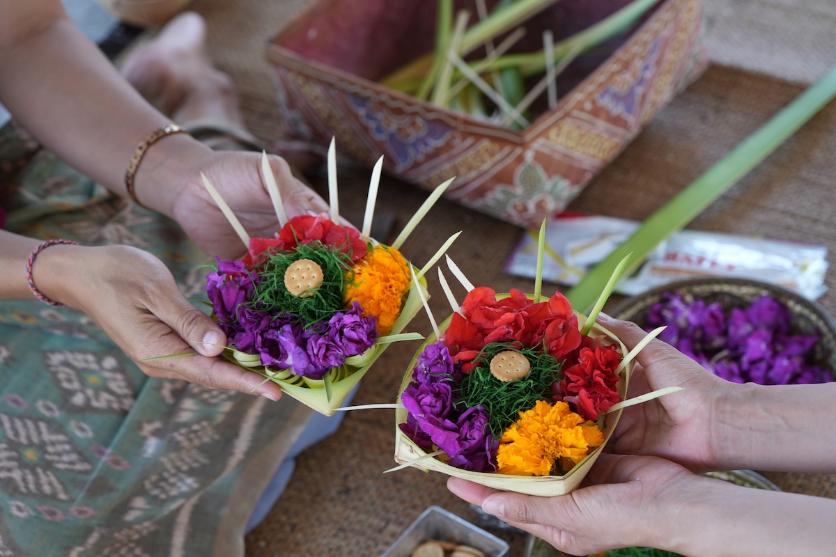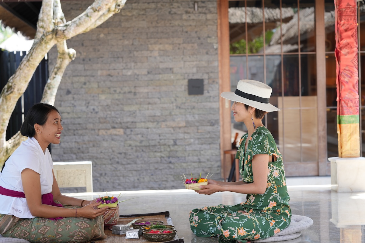 バリの暮らしに欠かせない、神々への祈りを捧げる花のお供え「チャナン」。その伝統的な手仕事を実際に体験できるワークショップ。椰子の葉を折り、色とりどりの花を丁寧に添えていく工程は、心を静め、自然への感謝を思い起こさせてくれるよう。完成したらリゾート内の祠にお供えし、旅の無事とこれからの幸せを祈ります。バリの精神文化に触れる体験は、滞在の余韻をさらに深めてくれるものに。