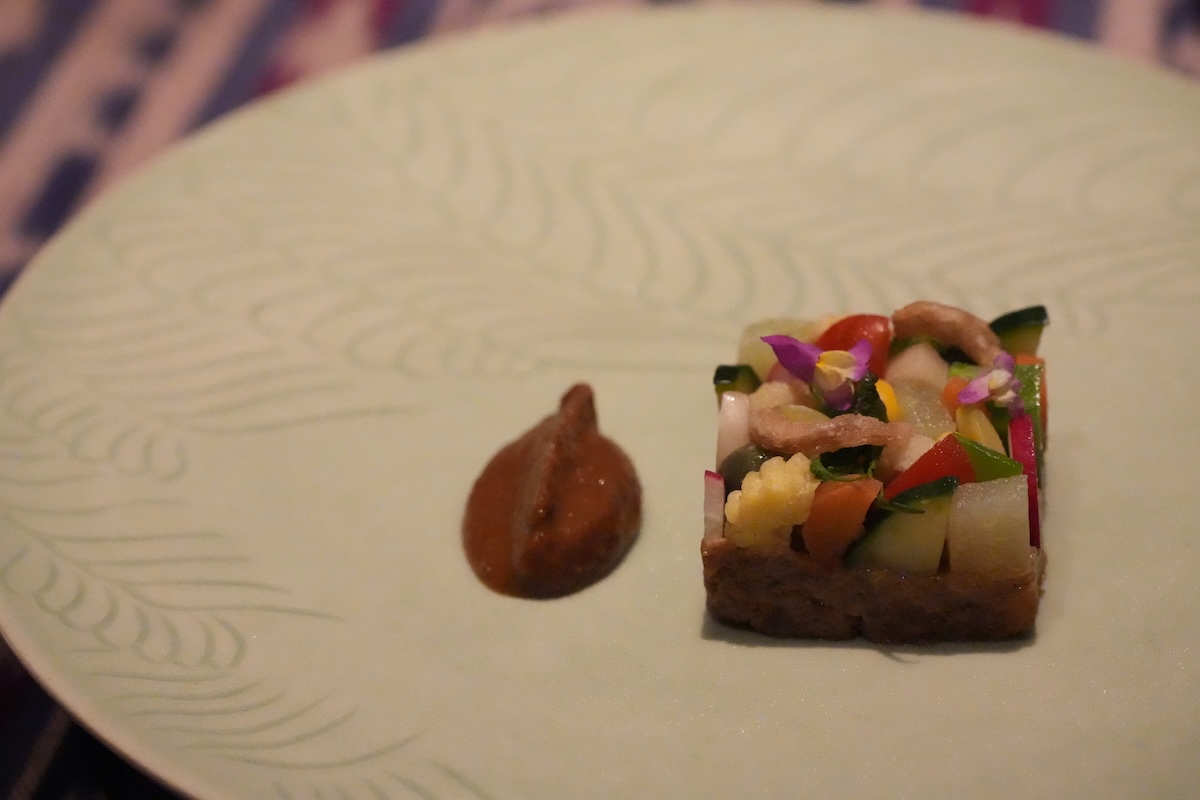 本日の野菜畑(ヤングココナッツ) 魚のタルタル ガドガドソースを添えて - 魚−海と山の対比