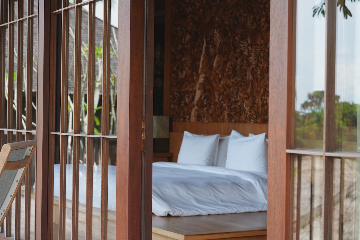 石畳の小径を進み、扉を開ければ、高い天井と木の温もりが広がるリビング、その奥にはキングサイズベッドを配した寝室。窓の向こうにはウブドの渓谷が織り成す壮大な景色が広がります。