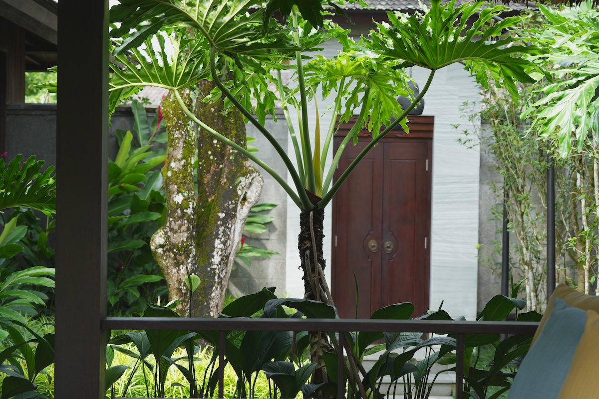 バリ・ングラライ国際空港から車で約90分、渋滞に巻き込まれると2時間以上のロングドライブに。街の喧騒を抜け、田園風景と深い森に囲まれたウブドの高台へ辿り着くと、まず現れるのは厳かなセキュリティゲート。さらに進むと目の前に聳えるバリ寺院を思わせる石彫りの門をくぐれば、そこはもう非日常への入り口。