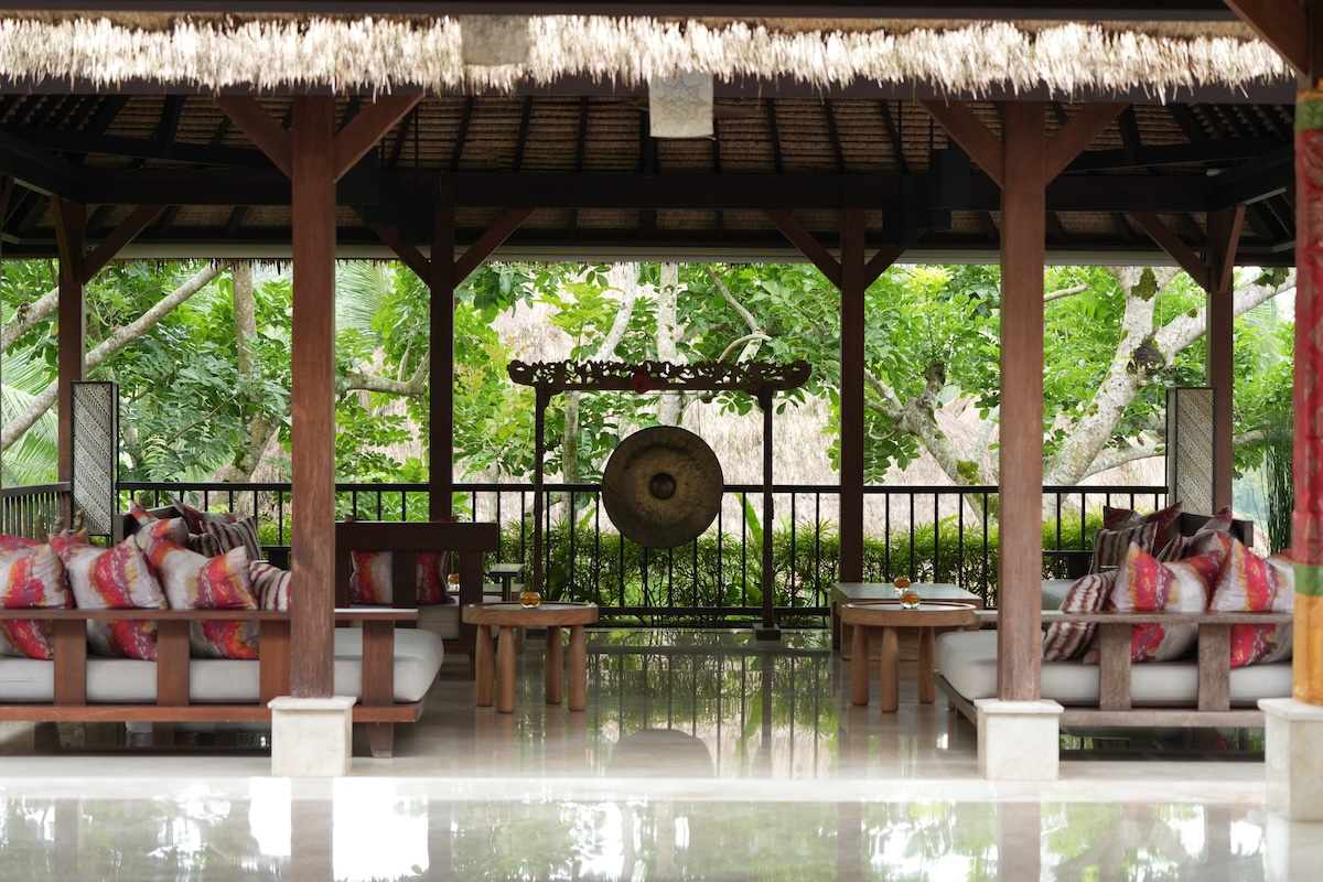 エントランスで迎えてくれたのは、伝統衣装に身を包んだスタッフの笑顔とガムランの生演奏、ほんのり甘いフランジパニの香り。