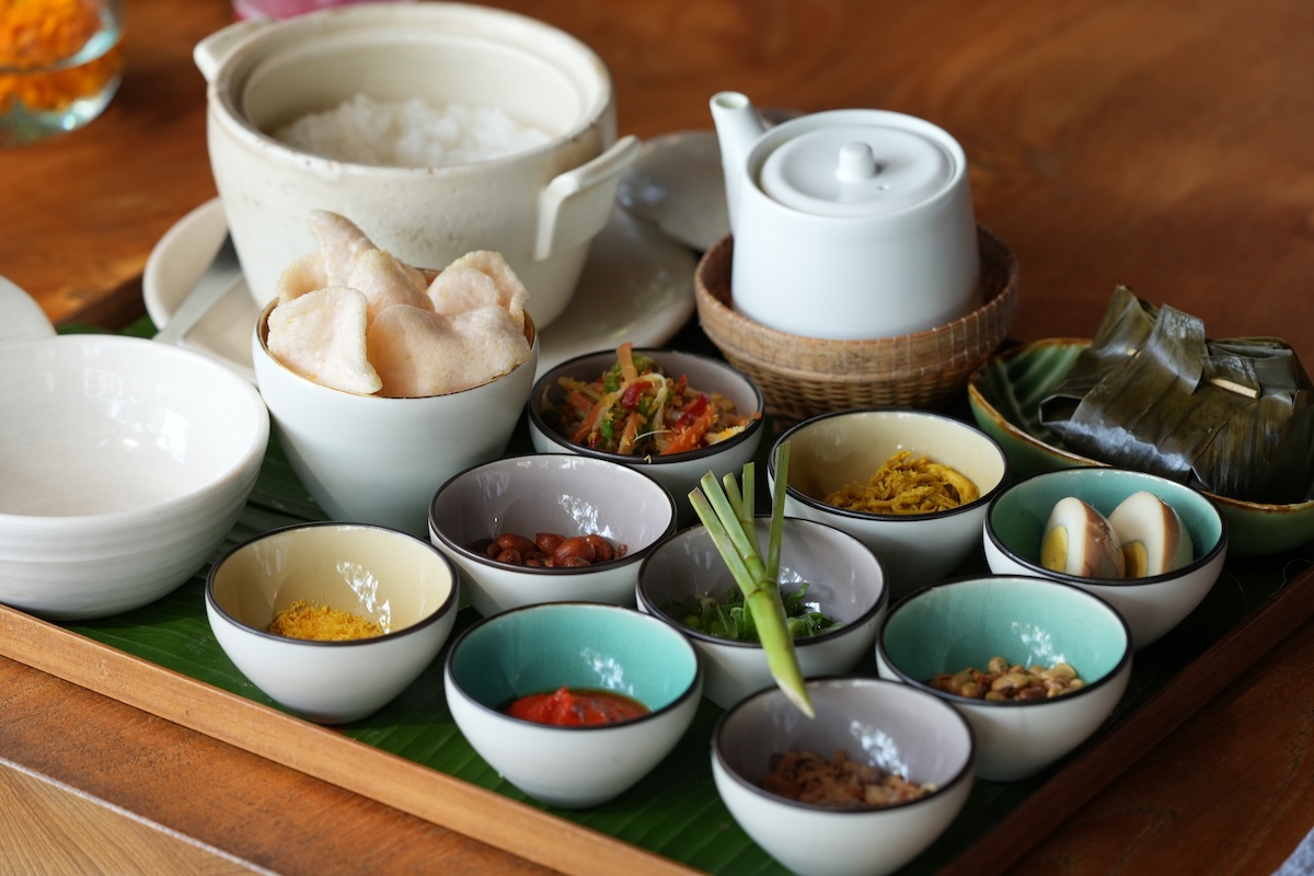 渓谷を渡る朝の光に包まれながら味わうのは、星のやバリらしいヘルシーで滋味深い朝食。南国フルーツプレートとそれを使ったフレッシュジュースから始まり、ナシゴレンやバリ式朝粥など土地の文化を映すメニューもあれば、日本食メニューもあり。体に
