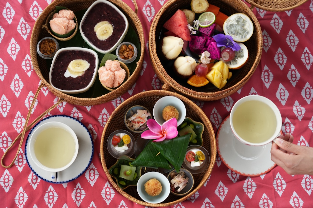 昼下がりには緑に囲まれたガゼボで優雅なアフタヌーンティーを。スコーン、チョコレートムース、パンナコッタといったアフタヌーンティーの定番メニューから、クエラピス、クエバギスといったインドネシアの伝統菓子、さらに手毬寿司やブルスケッタといったセイボリーまで、バリ式のしつらえで。心地よい風とともに午後のリズムをゆるやかに整えてくれます。