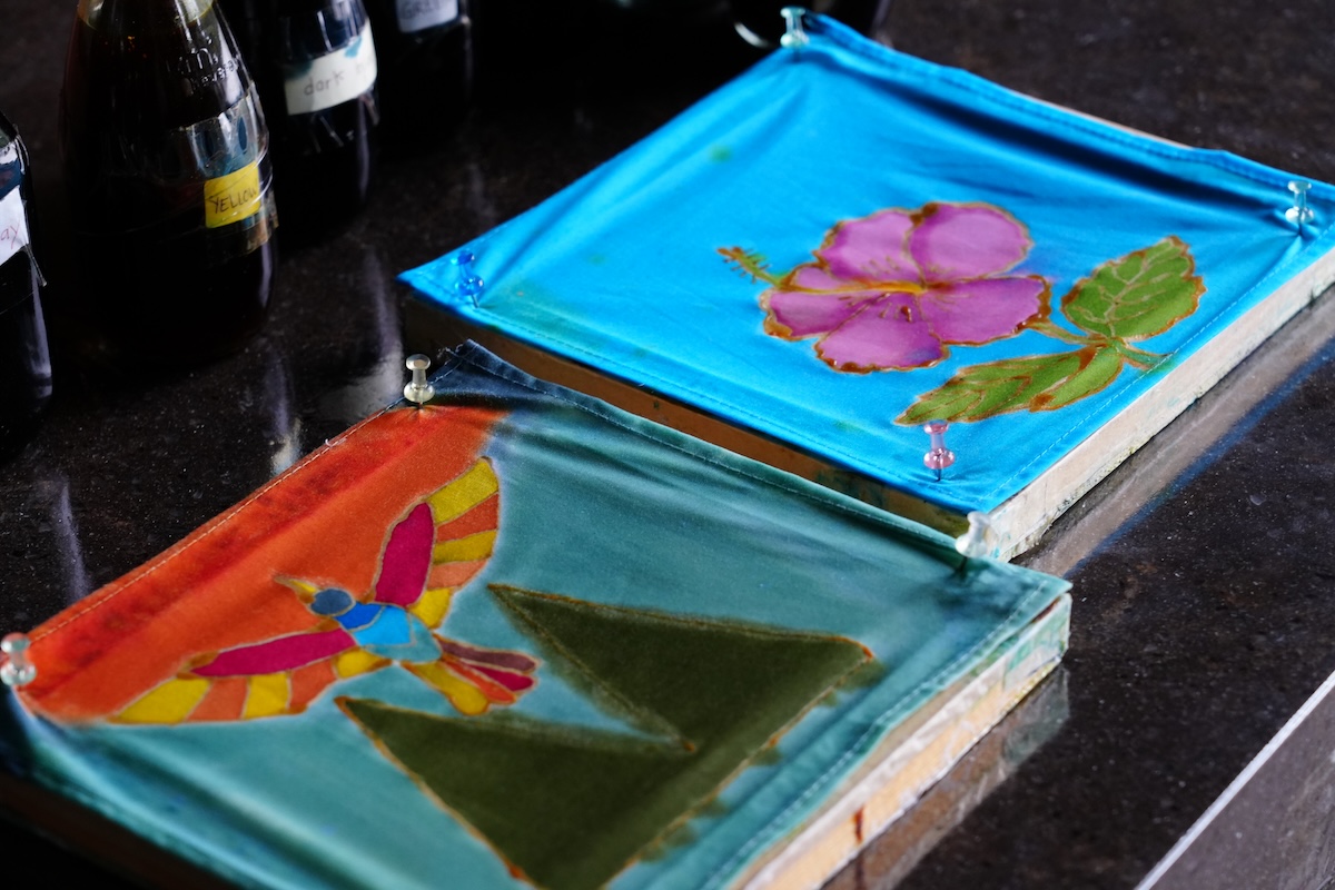 インドネシア伝統の「バティック・サヤ」体験のワークショップに参加。溶かした蝋で模様を描いて染め上げる布アートは、世界に一つだけの作品に。