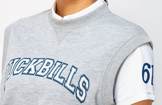 カレッジフォントのロゴがカッコいいスウェットは、お洒落見えするベストで新鮮さをアプデ。インナーをTシャツにスイッチしたら、よりデイリーに。