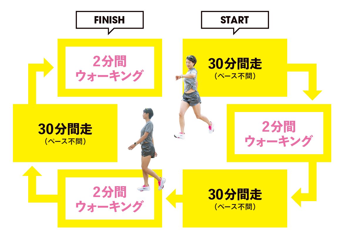 ウォーキングはダラダラ歩きではなく、速歩きで。呼吸が整ったら、再び30分間走へとスイッチします。これを繰り返すことで身体機能をフルマラソンの距離に耐え得るレベルにまで一気に引き上げることができます。