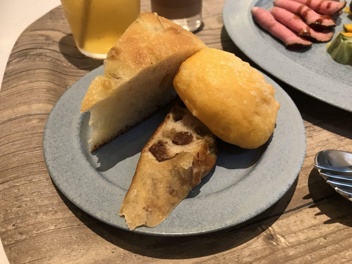 店内で焼き上げるハードパンの中から、豆腐と豆乳を練り込んだ、大豆の風味を感じる「豆腐と豆乳のフォカッチャ」(写真:左上)、米粉で仕込んだ、もちもち食感がクセになる「キャロットのリュスティック」(写真:右上)し、ラム酒に漬け込んだ2種類のレーズンをふんだんに使った「ナチューレザン」(写真:下)をオーダー。
