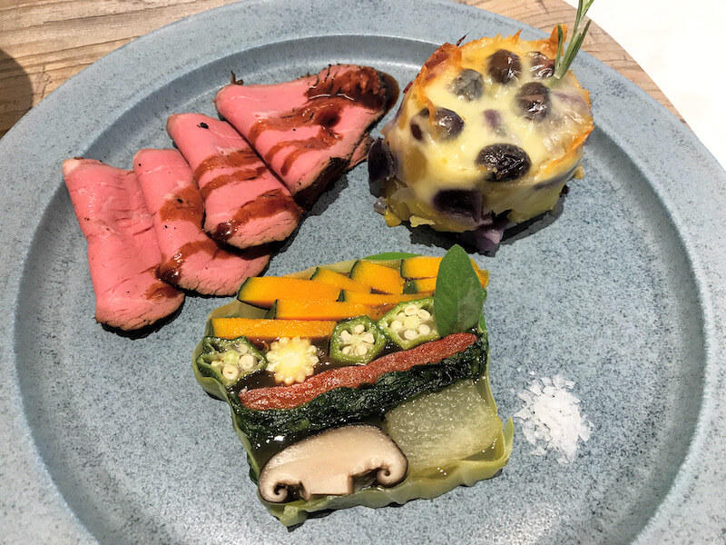 ロースターが厳選したコーヒー豆を使った「ローストビーフ」(写真:左上)、インカのめざめとシャドークイーンを使用しグラタン風に仕上げた「ゴルゴンゾーラピカンテ」(写真:右上)、季節によって色と食材を変え、旬食材と極みだし、少しの天然塩で仕上げた「BGT」テリーヌ(写真:下)。